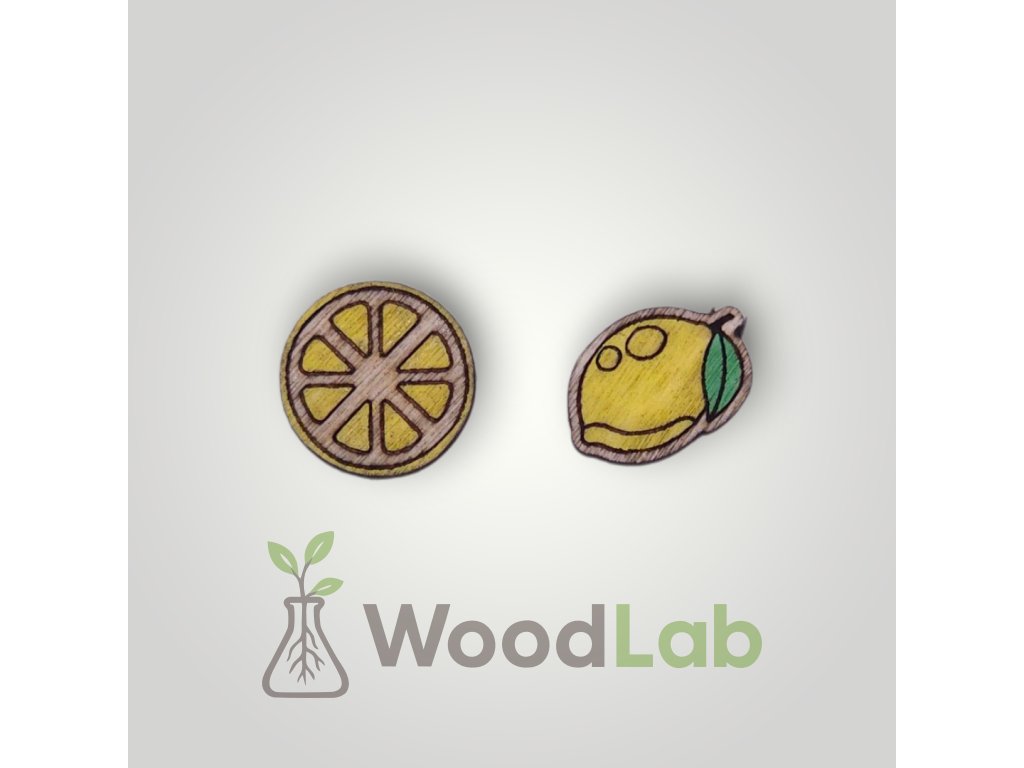 Dřevěné náušnice s motivem citronu jeden celý citron a jeden v řezu. Ideální pro milovníky ovoce a svěžího designu.