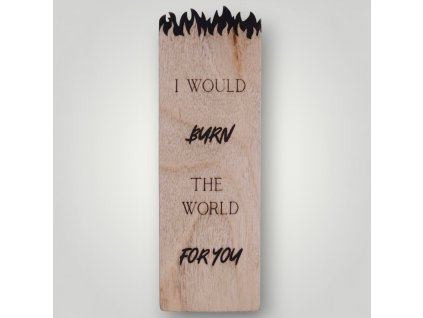 Dřevěná knihomolská záložka – "I would burn the world for you" – dramatická a vášnivá...