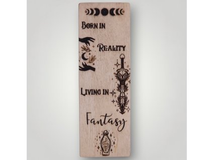 Dřevěná knihomolská záložka – "Born in reality, living in fantasy" – ideální pro...