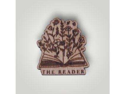 Dřevěný knihomolský odznáček – "The reader". Jednoduchý a stylový doplněk pro každého...