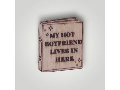 Dřevěný knihomolský odznáček – "My hot boyfriend lives in here". Perfektní pro všechny,...